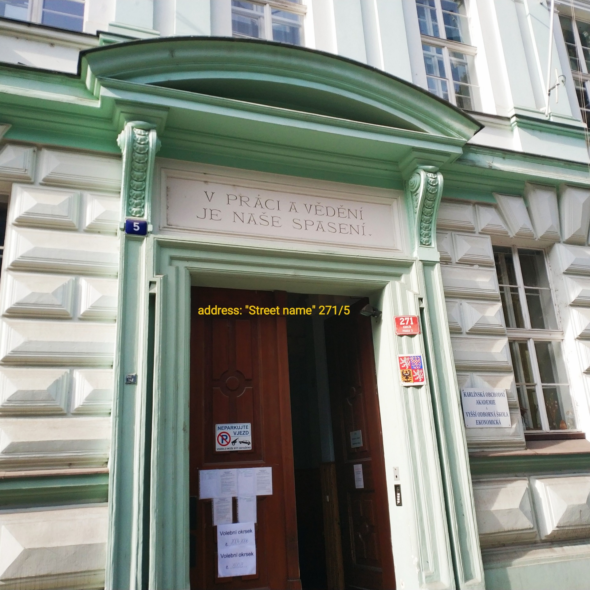 Address consists of the street of square name and two numbers. For example: Kollarova 271/5.